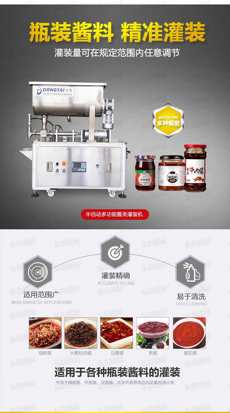 半自動灌裝機械,配置的自動攪拌器,保證了醬和油的充分混合,可灌裝顆粒漿狀流體物料在對辣椒醬、拌面醬、豆鼓等醬類進行灌裝時,灌裝量可在規(guī)定范圍內任意調節(jié),計量誤差小,該半自動醬類灌裝機采用壓縮空氣為動力可在各種環(huán)境中使用。