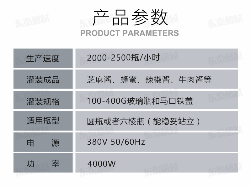 B、灌裝機采用橫推料的方式,縮短了下料斗到灌裝頭的距離,提高了灌裝速度,更重要的是解決了含油量大的物料在灌裝過程中出現(xiàn)的有的瓶油多,有些瓶醬多的灌裝難.,大大提高了灌裝精度。