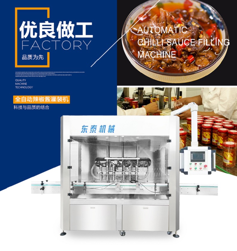 全自動辣椒醬類醬體灌裝生產(chǎn)線作為公司新研發(fā)的灌裝設備在市場上起到了關鍵性的作用,獨特的技術讓整個包裝市場變得富有生命力,是集光,機,電,氣于一體,采用活塞式定量原理,灌裝精度高,操作簡單,維護方便,設備主要材質(zhì):采用SUS304不銹鋼制造,符合衛(wèi)生要求.灌裝過程采用亞克力透明板與外界隔離,保證灌裝的衛(wèi)生要求。灌裝采用壓力式灌裝,無需配裝高位罐,簡化了安裝工序,提高了灌裝效率。可廣泛應用于食品、醬料行業(yè)產(chǎn)品的自動化包裝生產(chǎn)。幾乎能夠灌裝所有醬類、醬料物體是該款全自動辣椒醬類醬體灌裝生產(chǎn)線最大的優(yōu)勢,包括大塊肉醬、顆粒醬、濃醬、豆瓣醬、甜面醬、辣椒醬等。