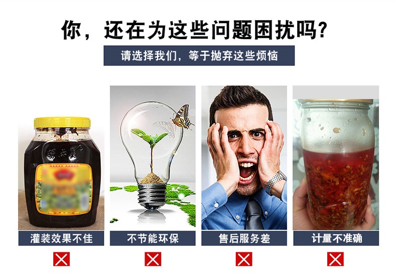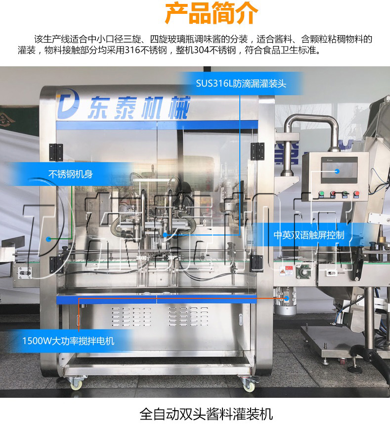 該生產(chǎn)線適合中小口徑三旋、四旋玻璃瓶調(diào)味醬的分裝,適合醬料、含顆粒黏稠物料的灌裝,物料接觸部分均采用316不銹鋼,整機304不銹鋼,符合食品衛(wèi)生標準。該機設計合理,機型小巧,立式結(jié)構,節(jié)省場地,操作方便。啟動部分均采用德國FESTO和臺灣AirTack的氣動元件。灌裝閥有氣動閥控制,灌裝精度更高,灌裝量和灌裝速度均可任意調(diào)整,灌裝悶頭采用防拉絲及升降灌裝裝置。