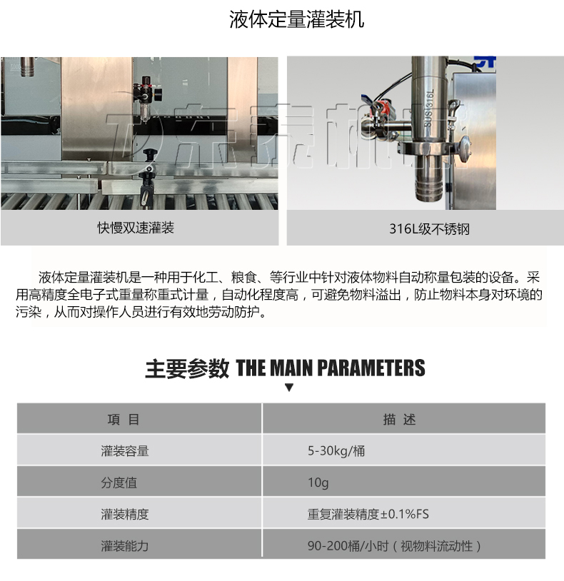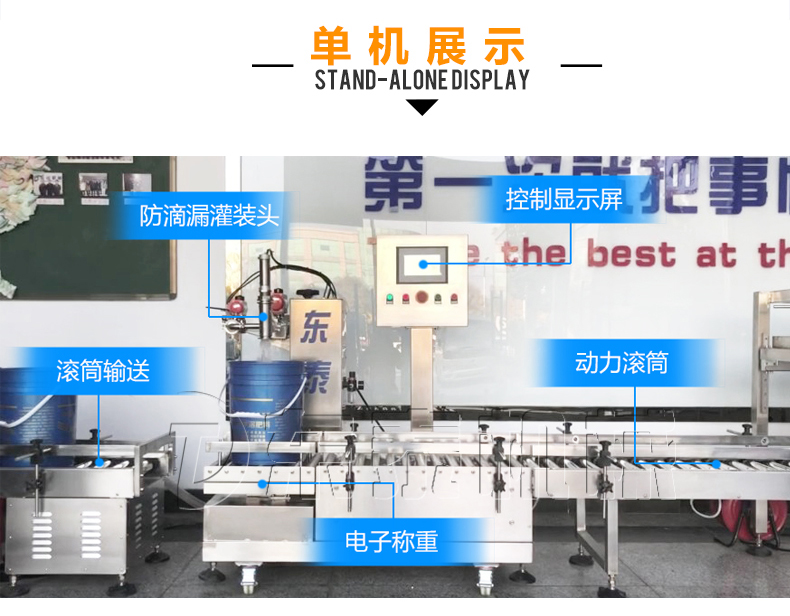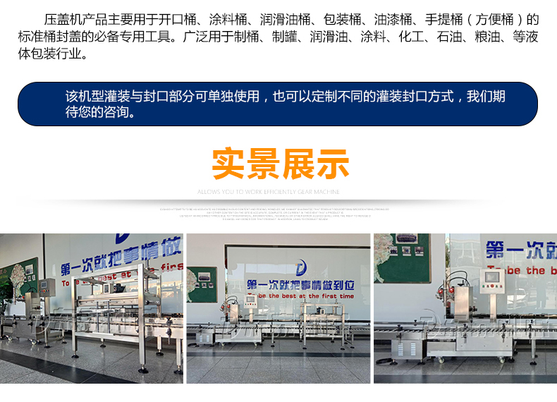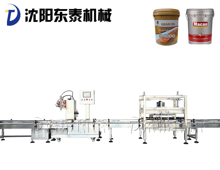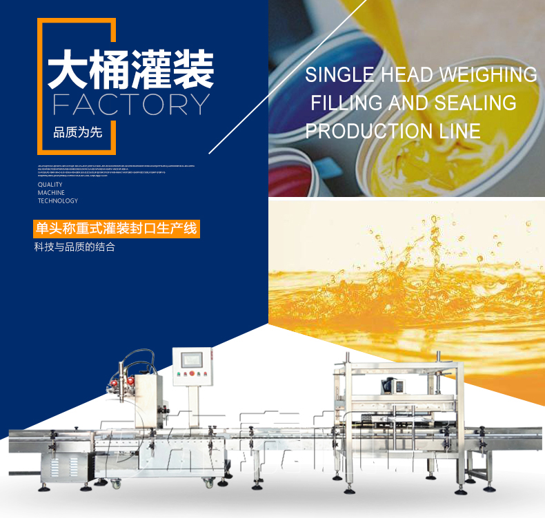 稱重式灌裝封口生產(chǎn)線為半自動單頭稱重式灌裝機搭配在線式壓蓋機,設(shè)備小巧、實用適合5-30KG敞口桶的灌裝(其它桶型可定制),灌裝時由人工放置空桶,并啟動開始按鈕,待灌裝完畢后放蓋并將桶推岀灌裝位置,動力滾筒自動傳送至壓蓋杋進(jìn)行壓蓋。壓蓋完畢后可輸送至成品輸送機上完成整個操作過程,全程僅需一人即可完成整個生產(chǎn)過程。此型號灌裝機為客戶大大降低了生產(chǎn)勞動成本,是大中小型液體灌裝企業(yè)的理想選擇。
