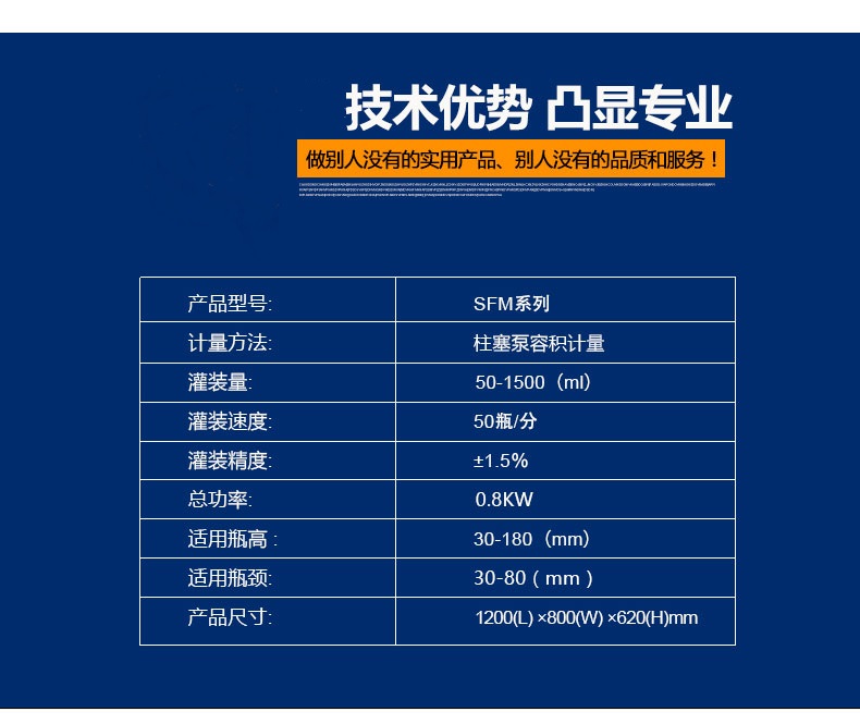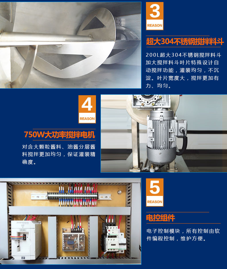 產(chǎn)品簡介:半自動醬類醬料灌裝機(jī)SFM系列結(jié)構(gòu)合理、機(jī)型小巧、性能可靠、定量準(zhǔn)確、操作方便。整機(jī)304不銹鋼,灌裝悶頭防漏料防滴油,氣缸驅(qū)動結(jié)構(gòu),加大200L料斗,品牌全鋁殼銅芯大功率攪拌電機(jī),變頻調(diào)速,PLC智能控制,用戶可根據(jù)需要任意調(diào)節(jié)灌裝量及灌裝速度,灌裝精度高。