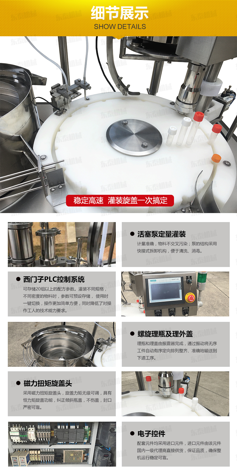 診斷試劑灌裝旋蓋一體機在性能上、質(zhì)量上液體灌裝機具有高速、可靠性強、產(chǎn)量高等優(yōu)點,為整個行業(yè)的發(fā)展來說帶來了巨大的發(fā)展商機,也為液體類商品帶來更廣闊的發(fā)展前景。液體灌裝機的操作簡便,運行穩(wěn)定,能有效節(jié)省企業(yè)成本,即可單機使用,也可進行搭配理瓶機、液體灌裝機、旋蓋機、封口機、貼標(biāo)機等等設(shè)備組成一條生產(chǎn)流水線作業(yè),各單機能獨立完成其工作,有獨立的操作系統(tǒng),各單機聯(lián)動、分離快捷,并且調(diào)整快速、簡單,使生產(chǎn)的每個工序保證協(xié)調(diào)。廣泛應(yīng)用于食品、化妝品、醫(yī)藥、油脂、日化、洗滌劑、農(nóng)藥、化工等行業(yè)的灌裝。