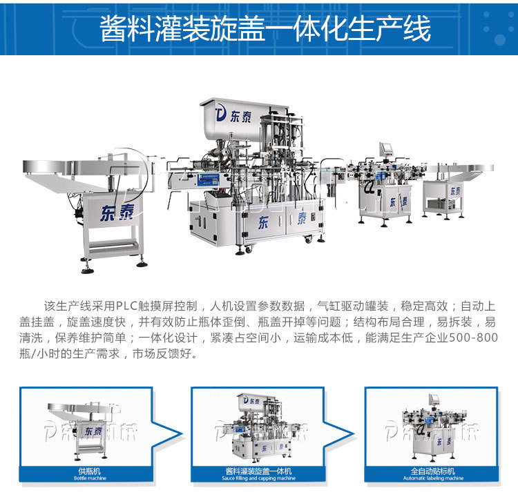 作為國(guó)內(nèi)專業(yè)的醬料灌裝機(jī)廠家,我們東泰機(jī)械能夠在市場(chǎng)中不斷實(shí)現(xiàn)創(chuàng)新和突破,是我們結(jié)合了市場(chǎng)的真實(shí)情況以及客戶的真實(shí)需求來(lái)不斷跟隨市場(chǎng)的需求和需要進(jìn)行變化,從而掌握市場(chǎng)的主動(dòng)權(quán),才致使醬料灌裝機(jī)朝著高端化、智能化的方向前行,來(lái)得到更多消費(fèi)者的好評(píng)和認(rèn)可,辣椒醬再我們生活之中已經(jīng)是屬于再熟悉不過的產(chǎn)品了,雖說(shuō)醬料的好處比較多,也可以提高食物的口味,但是你可能不知道的是,味道好的醬料也是離不開包裝,既然有了包裝的需求自然離不開醬料灌裝機(jī)。